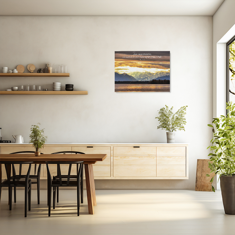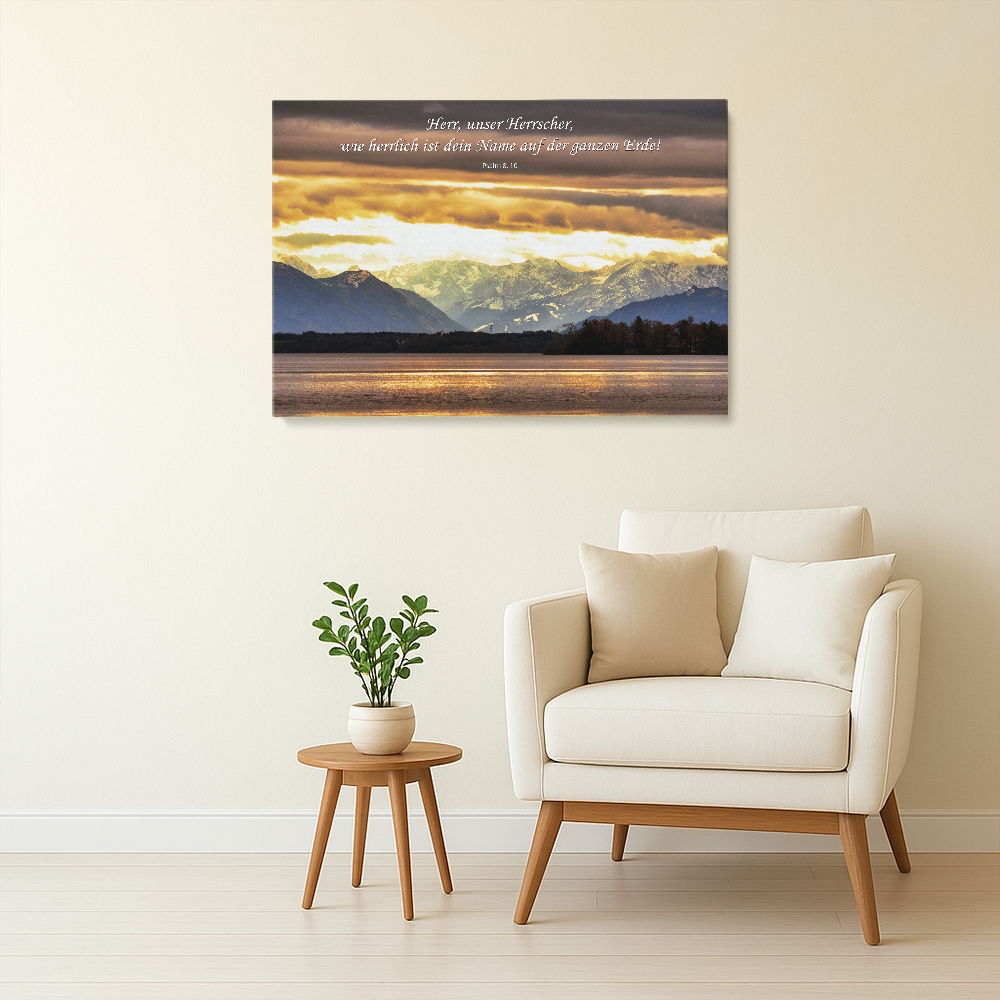 Dieses christliche Leinwandbild „Ammersee – Psalm 8,10“ lädt zum Staunen ein – über die Größe und Herrlichkeit Gottes, die sich in seiner Schöpfung widerspiegelt. Der Blick über den goldenen See hin zu den majestätischen Alpen unterstreicht die Worte: „Herr, unser Herrscher, wie herrlich ist dein Name auf der ganzen Erde!“