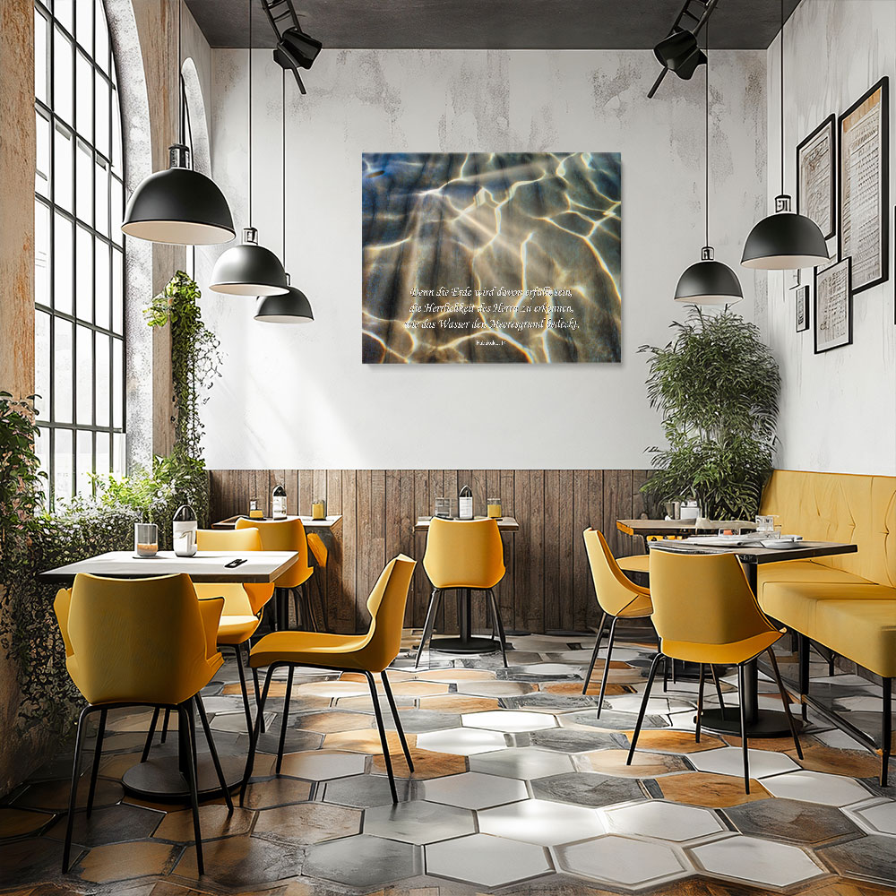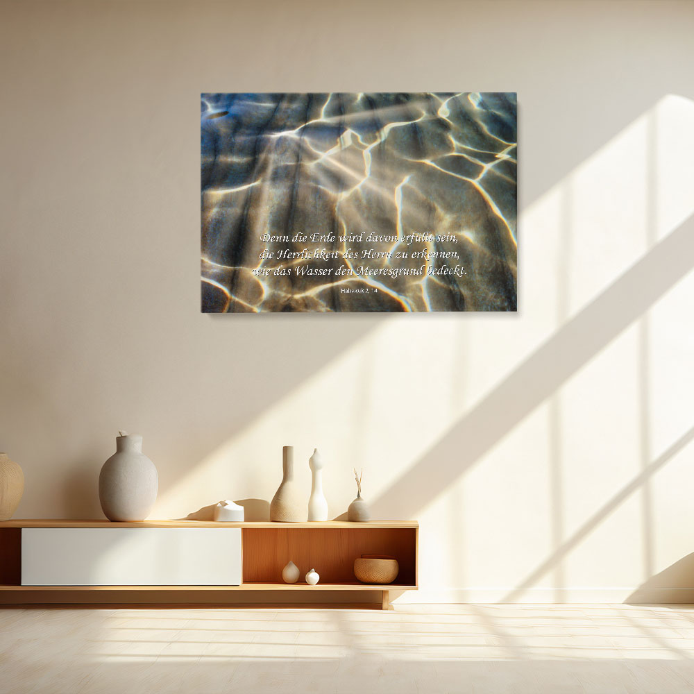 Habakuk 2,14 (Luther 2017)Licht durchflutet den Meeresgrund – Sinnbild für die Tiefe von Gottes Herrlichkeit. Dieses christliche Leinwandbild erinnert daran, wie umfassend Seine Gegenwart die Welt erfüllt.