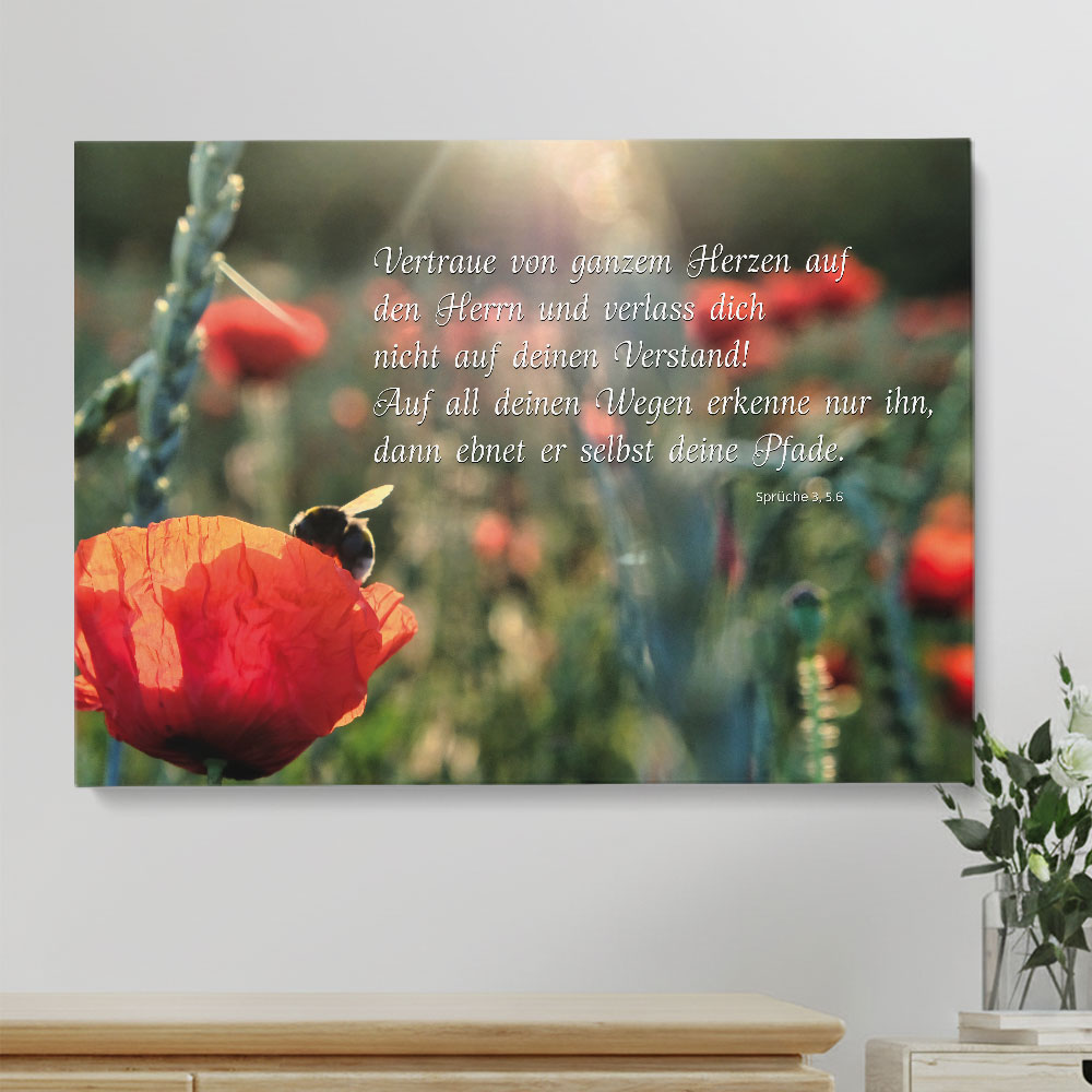 Sprüche 3, 5.6 (NeÜ)Leinwand „Mohnfeld Biene“ – Sprüche 3,5.6.