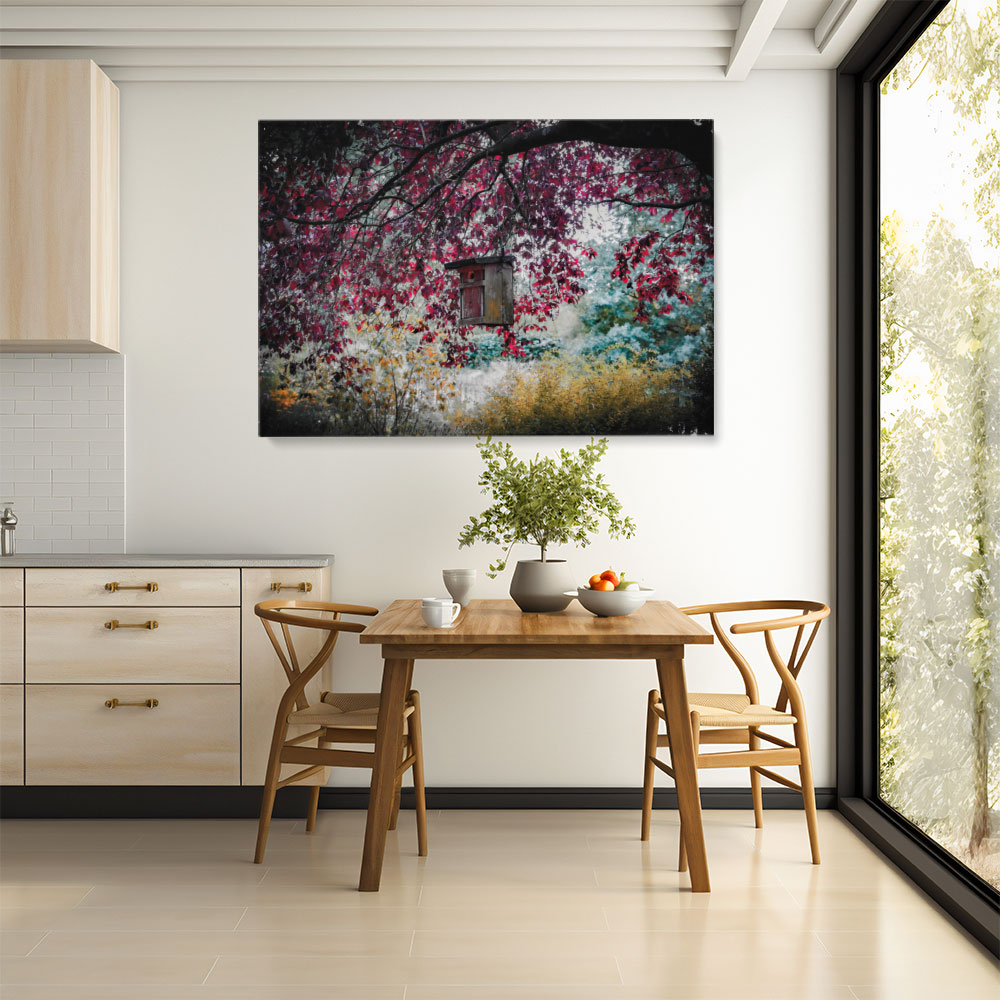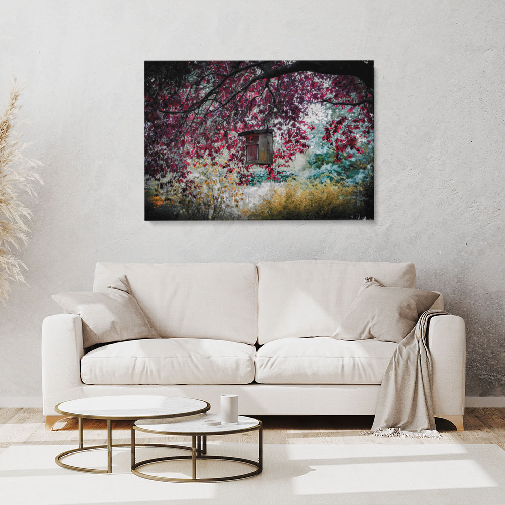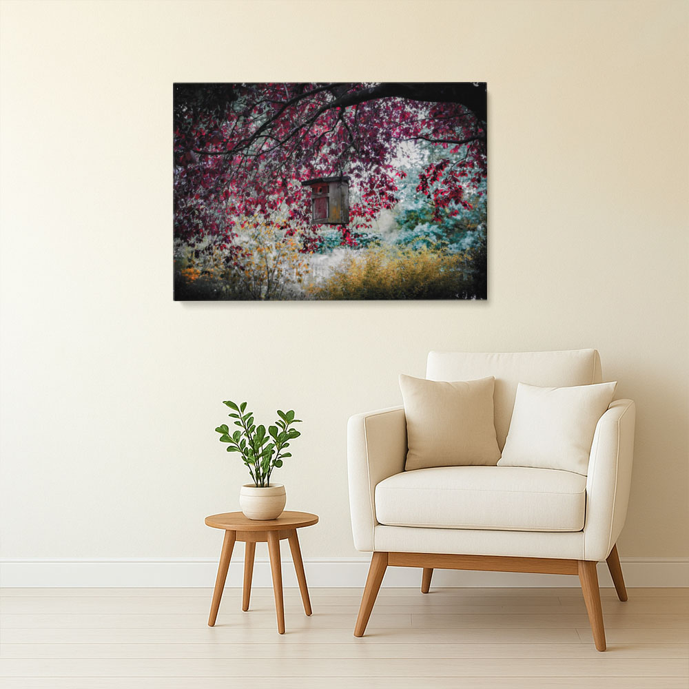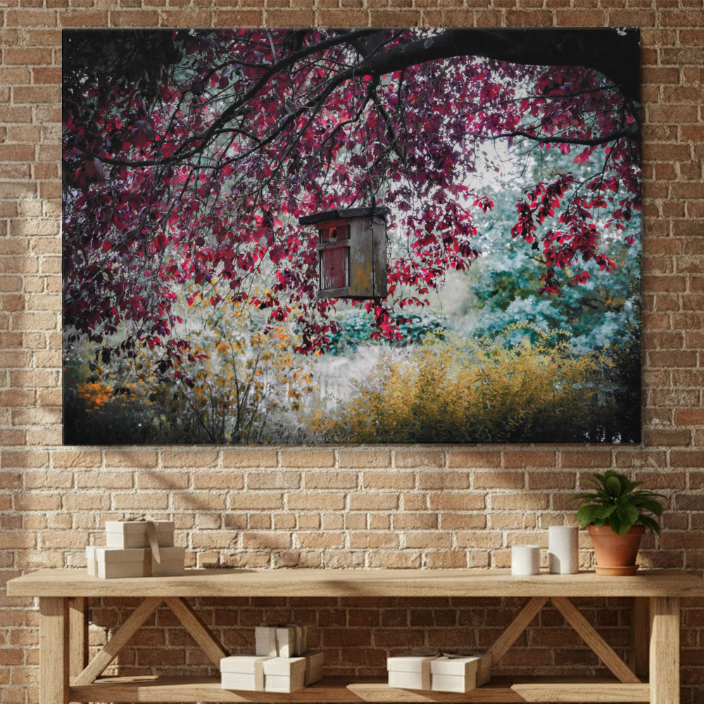 „Friedensort“ wirkt wie ein stilles Versprechen: Mitten im Leben gibt es einen Platz, an dem das Herz zur Ruhe kommt. Der schwebende Nistkasten im Schutz der roten Blätter erinnert an eine feste Zuflucht – wie ein sicheres Nest, ein Ort der Geborgenheit, an dem Angst leiser wird und Frieden Raum gewinnt.